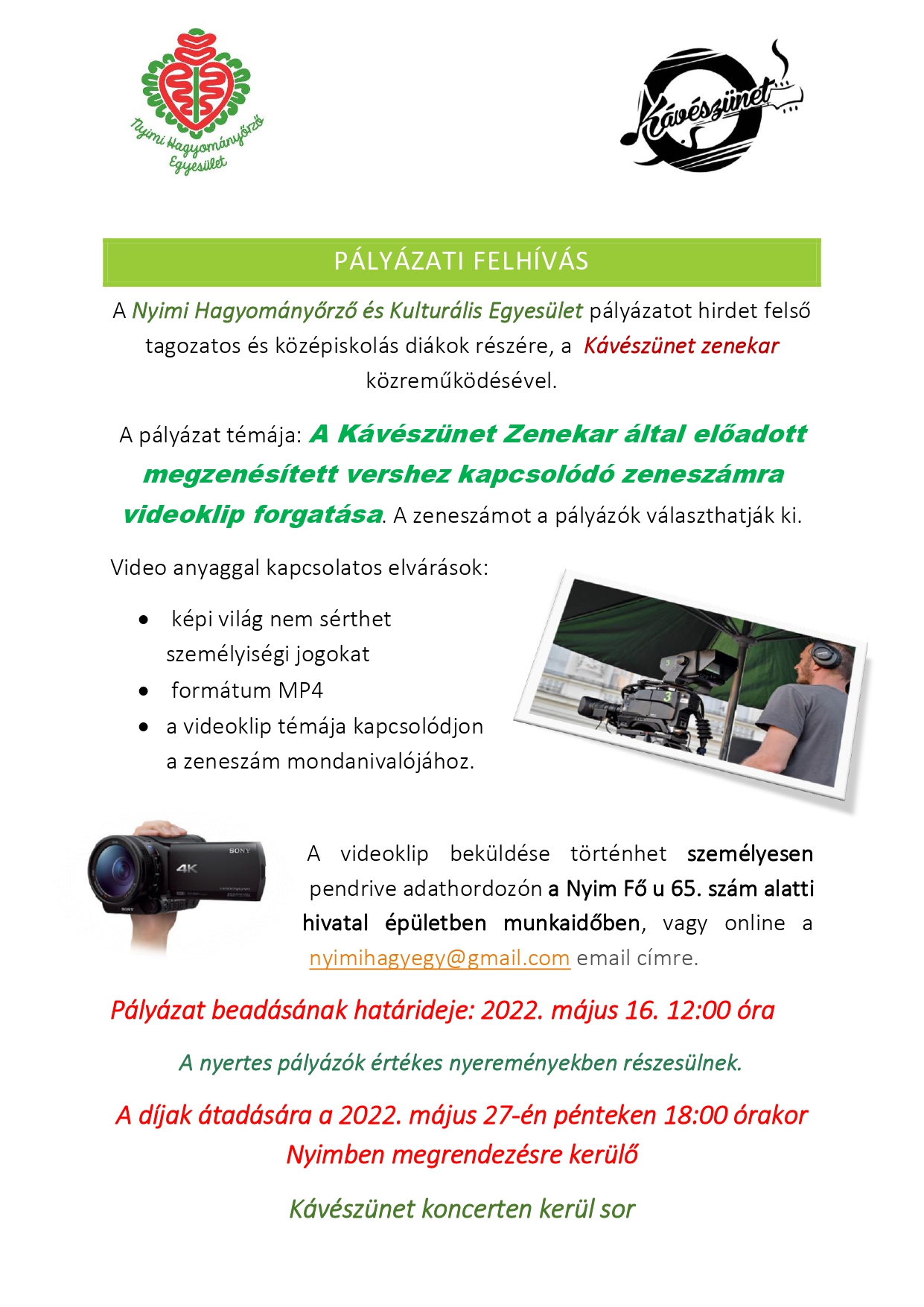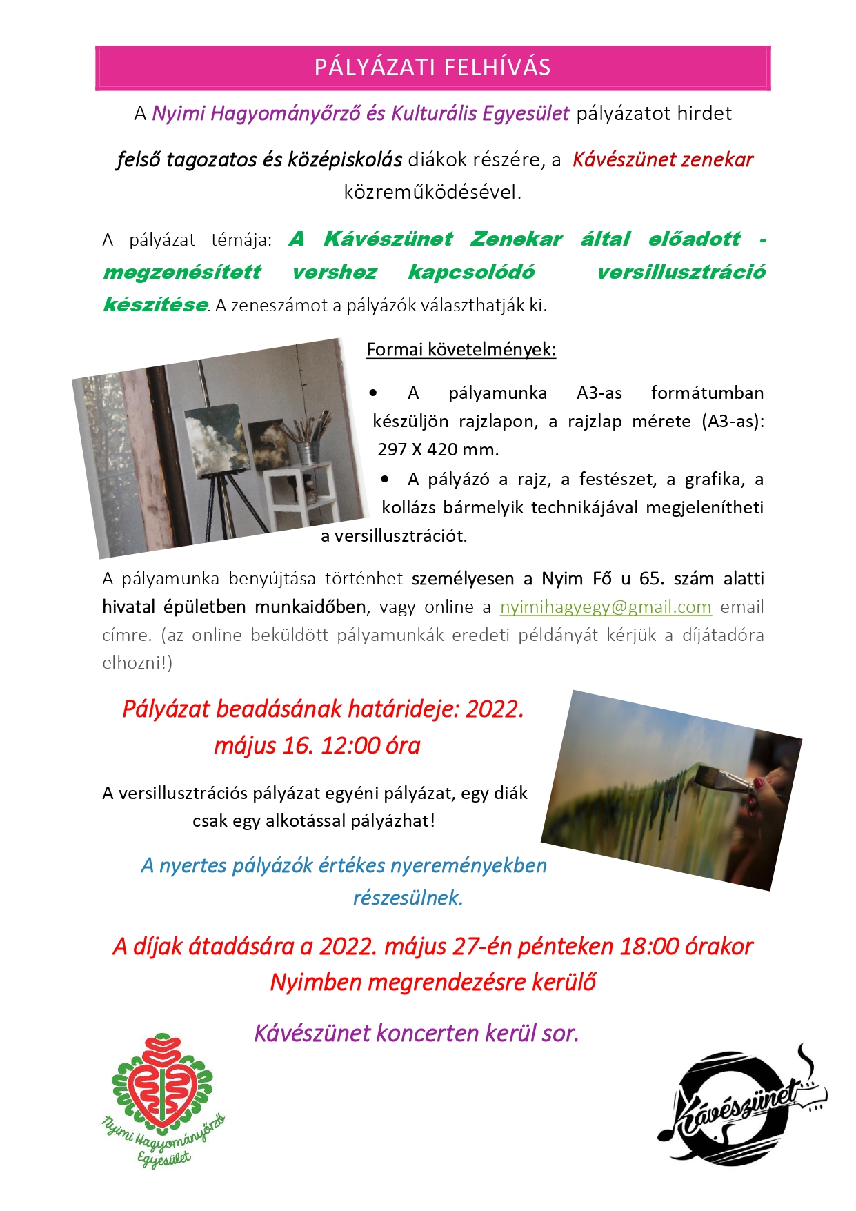 Kedves Nyimiek és érdeklődők! Szeretnénk felhívni a figyelmet két pályázati felhívásra, melyet lentebb megosztunk Önökkel. A Nyimi Hagyományőrző és Kulturális Egyesület pályázatot hirdet felső tagozatos, és középiskolás diákok számára. Bíztatunk minden érintett diákot, ha ötletetek van, ne habozzatok, valósítsátok meg, a tehetségeteket mutassátok meg!