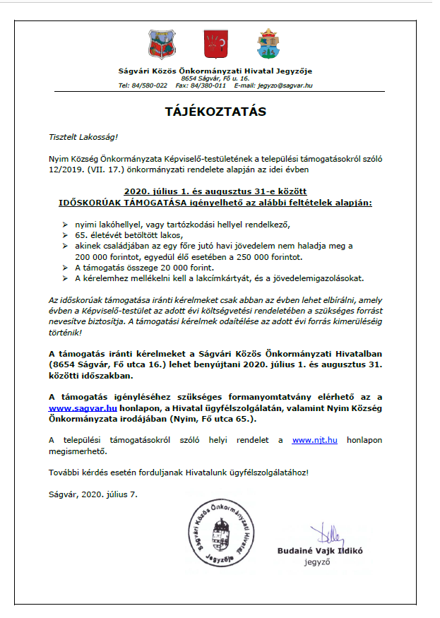Nyim Község Önkormányzata Képviselő-testületének a települési támogatásokról szóló 12/2019. (VII. 17.) önkormányzati rendelete alapján az idei évben